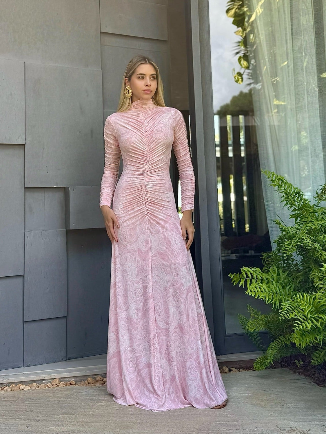 Vestido fabricado em Tule em estampa exclusiva de cashmere da Fernanda Farah com detalhes Franzidos na parte de frente e trás do vestido e mangas longas