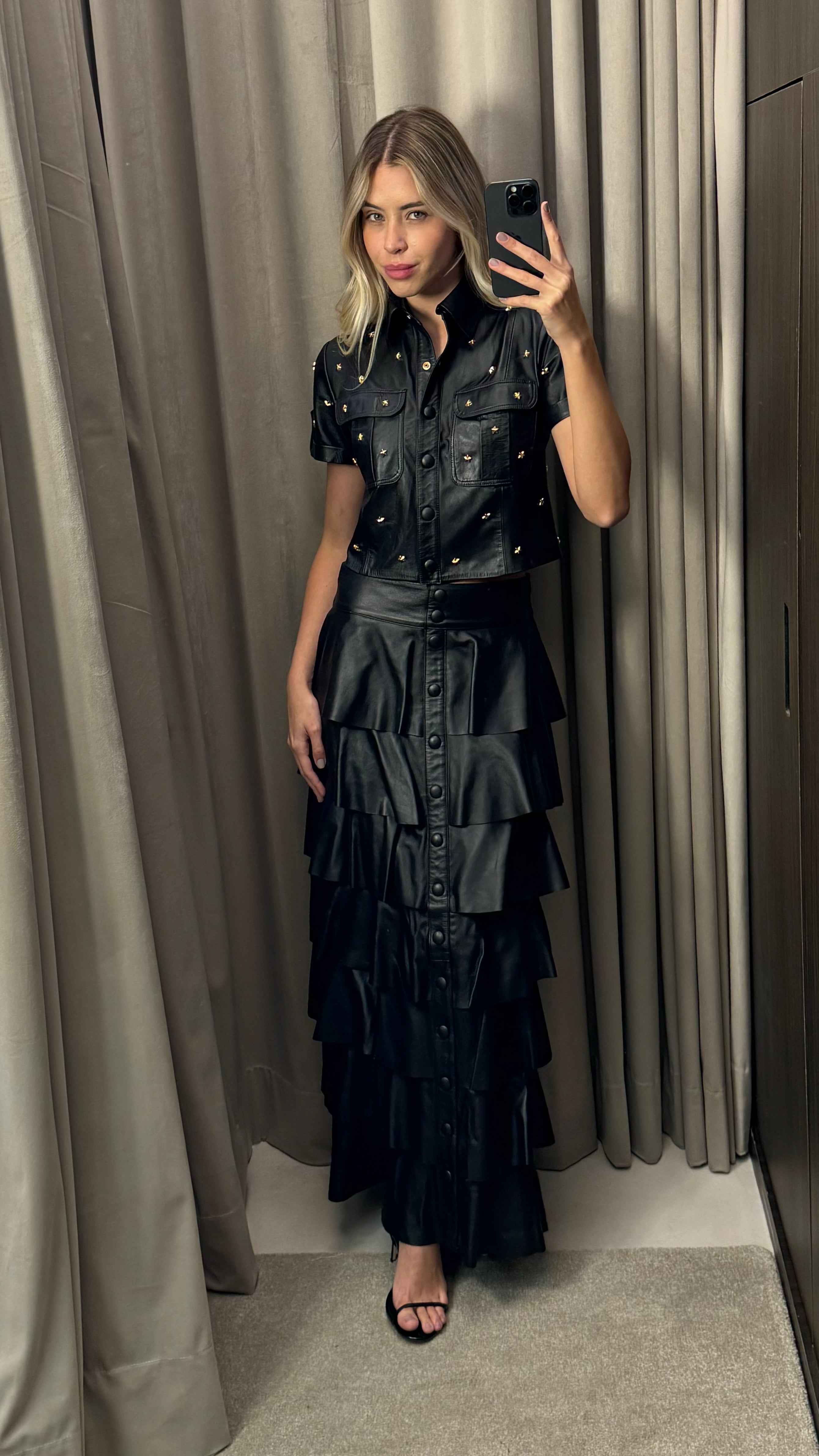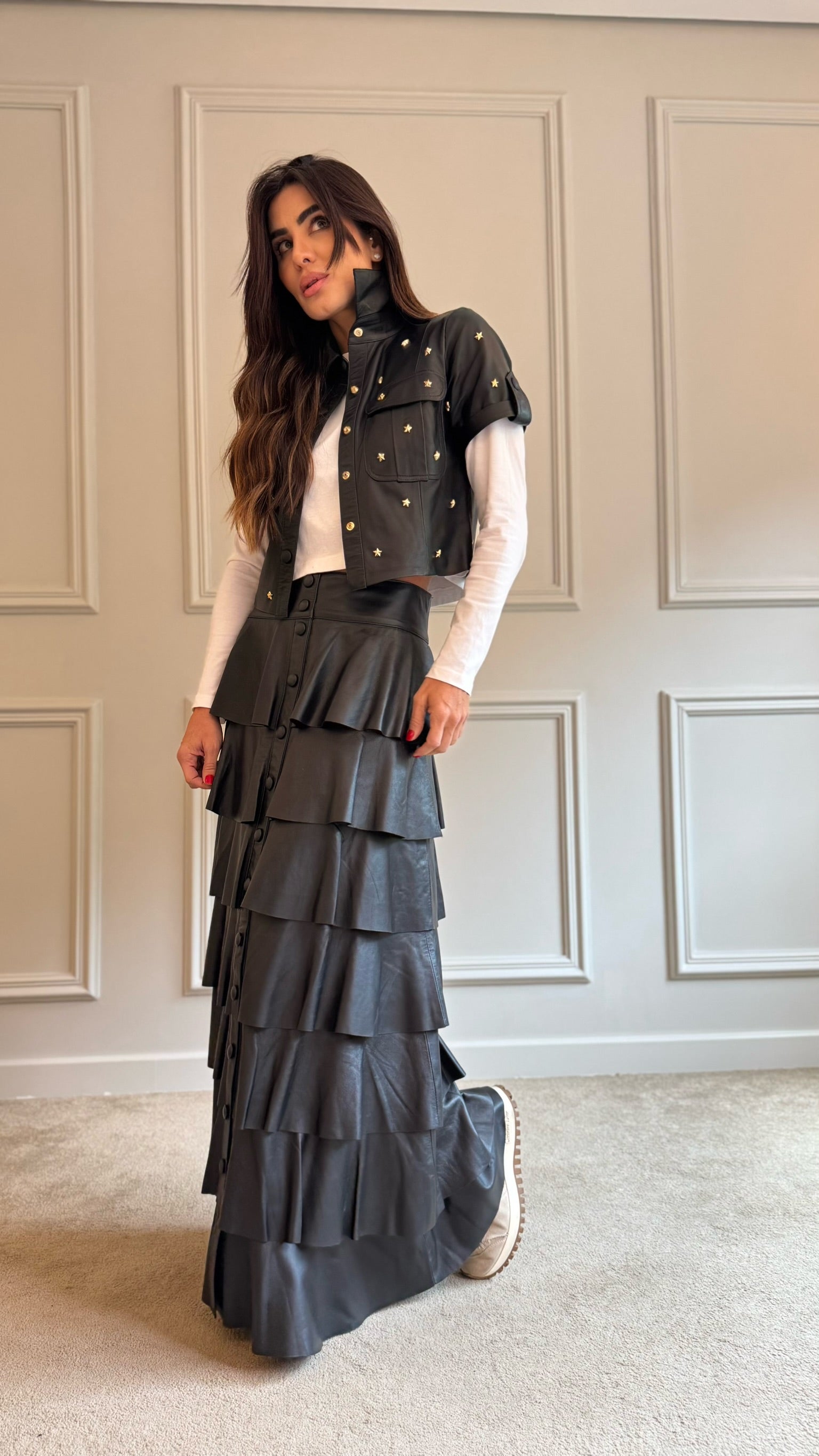 Cropped Couro com fechamento em botões e bordado em mini estrelas douradas