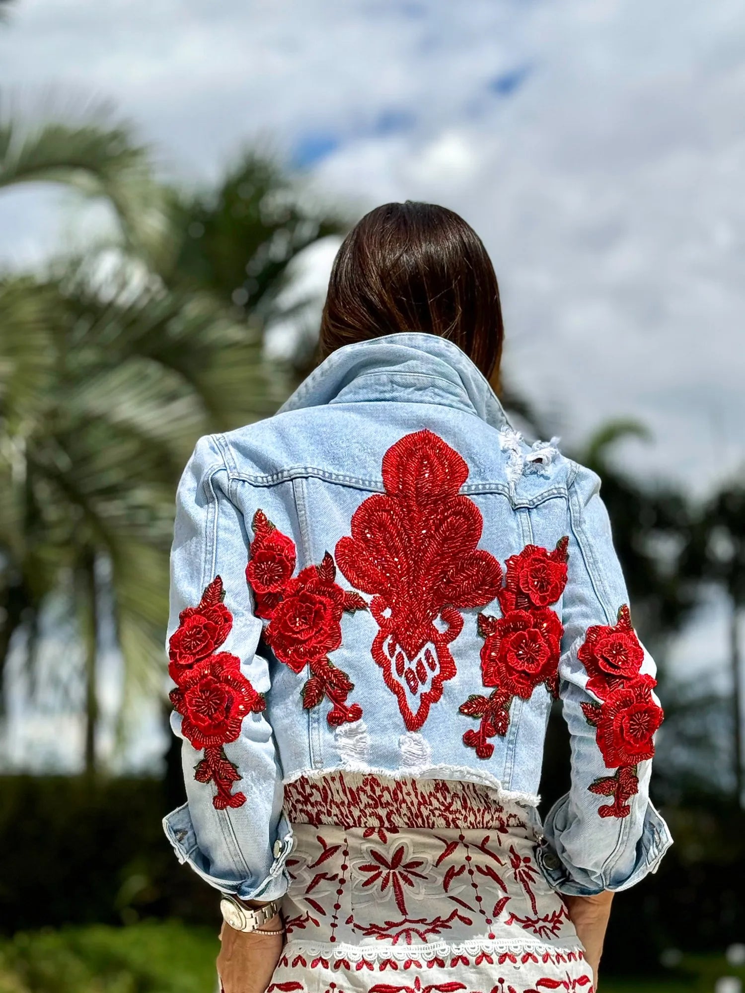 • Jaqueta Bordada Arabescos Vermelhos JEANS CLARO